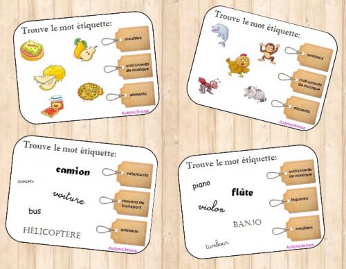Une grande étiquette pour la catégorie et les élèves plaçaient les petites étiquettes des images en dessous.