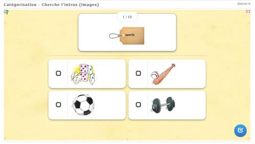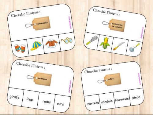 Enfin un atelier cartes à pinces pour chercher l’intrus parmi une catégorie, avec des images et des mots :